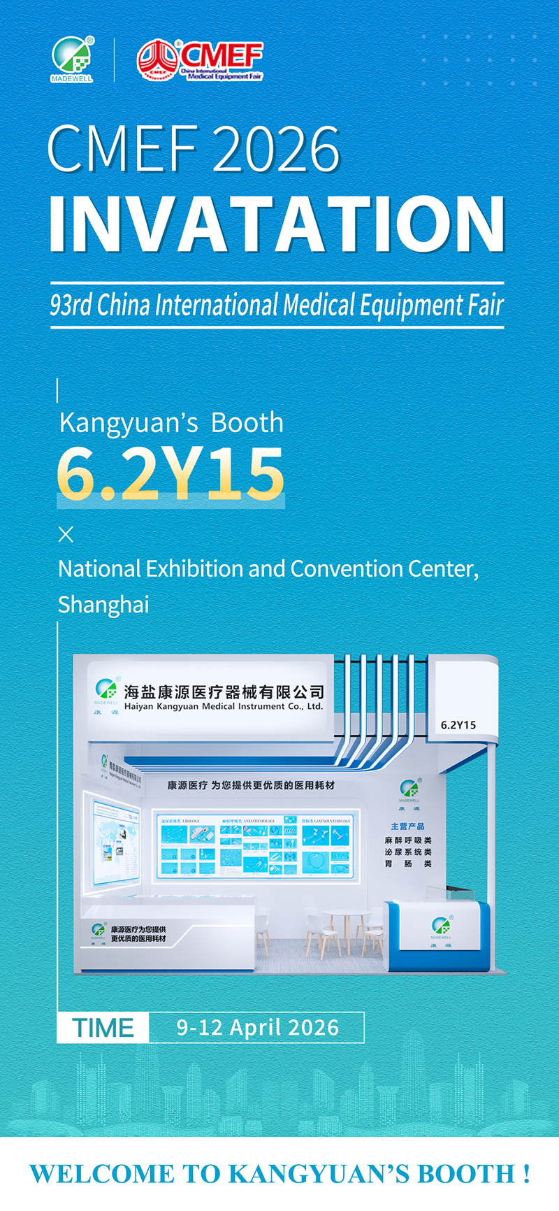The 93rd CMEF will be held at the National Exhibition and Convention Center (Shanghai) from April 9 to 12, 2026. At that time, Kangyuan Medical will showcase its full range of products (such as various Silicone Foley Catheter, Silicone Foley Catheter with Temperature Probe, Painless Silicone Foley Catheter, Laryngeal Mask Airway, Endotracheal Tubes, Breathing Filters, various Mask, Silicone Stomach Tube, Gastrostomy Tube, Tracheostomy Tube, Suction-Evacuation Access Sheath, etc.) in Hall 6.2. Our booth number is 6.2Y15. We look forward to your visit.